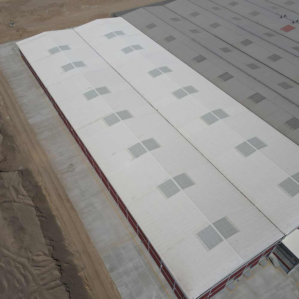 Para el proyecto BSF Almacenes del Perú, se utilizaron coberturas termoacústicas multicapa de UPVC Klar, Perfil TK6S en 2.50 mm Blanco para techos, y Perfil TK6S SUN para los pasos de luz (15%). El área total fue de 12,500 m².