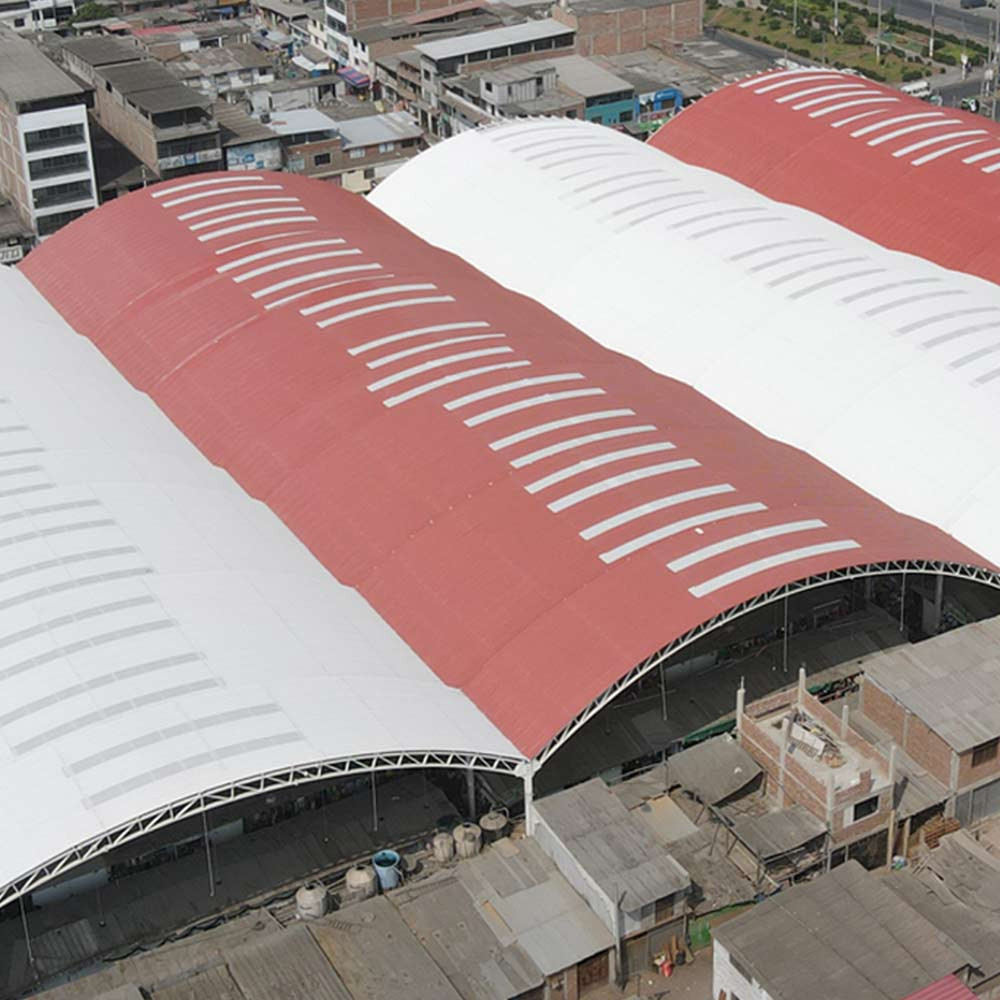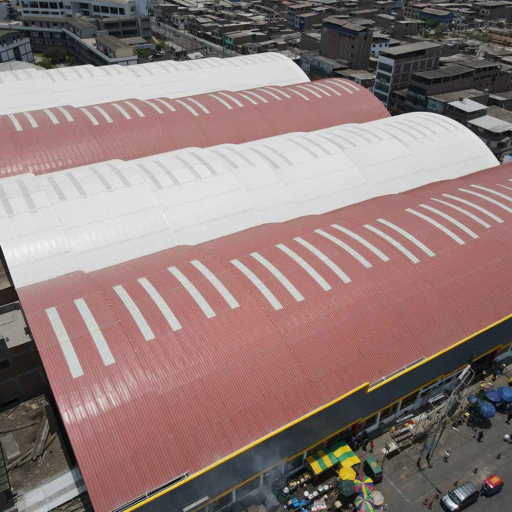 Para el proyecto se utilizaron nuestras coberturas termoacústicas multicapa de UPVC Klar en el perfil TK5 de 2 mm en color rojo teja y blanco. Para el paso de luz natural se utilizaron nuestros paneles TKSun de 1.20mm Opal. Los paneles Klar se adaptan muy bien a techos curvos y no necesitan ser pre curvados.